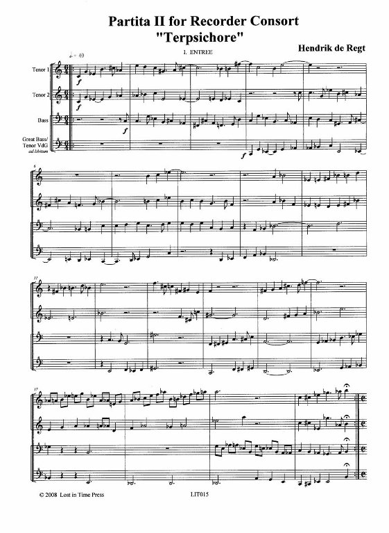 LIT015 Hendrik de Regt, Partita II for Recorder Consort “Terpsichore.” Score and parts (Quartet: T T B GtB. Alternate part 4 for tenor viola da gamba). “Entrée,” “Allemande,” “Courante,” “Sarabande,” “Bourree,” “Musette,” “Air,” “Menuet,” “Ricercare,” “Galliarde.” Level: Advanced (7-8). $22.00