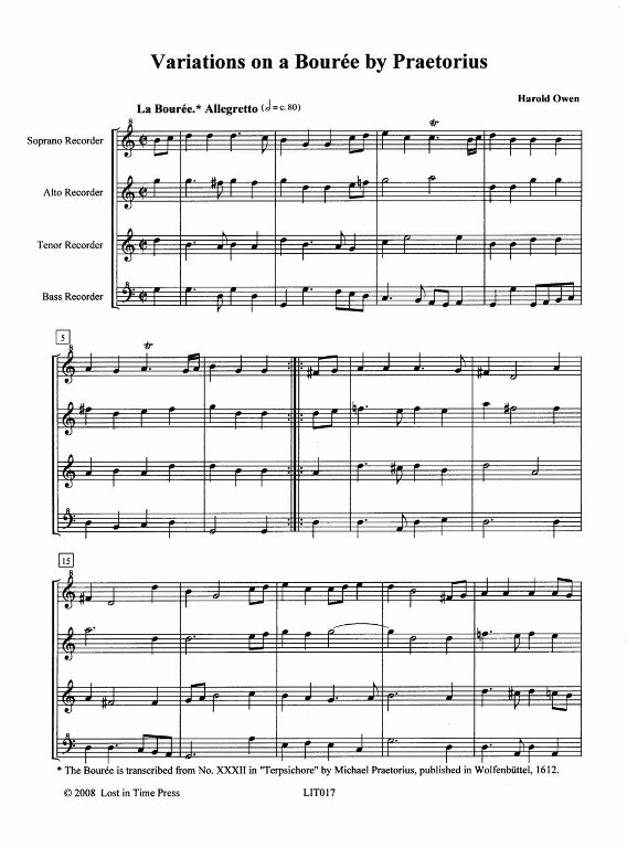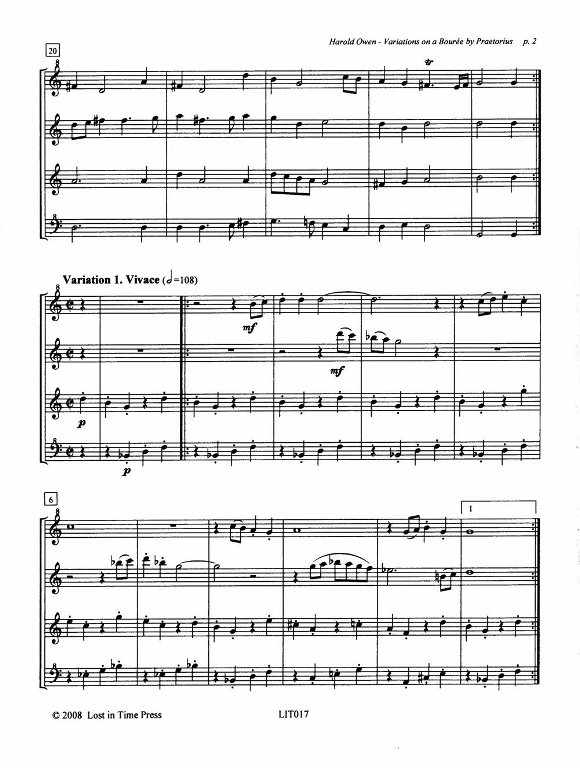 LIT017 Harold Owen, Variations on a Bourée by Praetorius. Score & parts (Quartet: S A T B). Theme and seven variations. The theme returns with divisions. Level: Mixed, Intermediate & Advanced (6-7). $20.00