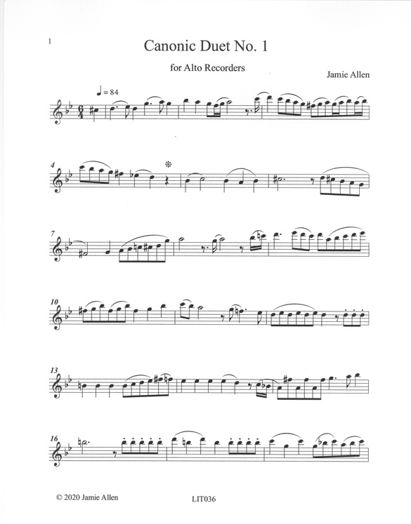 Music for playing from afar or in person. In the composer's own words: "Soon after the Covid-19 pandemic led to shelter-in-place orders throughout North America, I started experimenting with compositional approaches that would allow fellow recorder players to continue to enjoy a sense of camaraderie while staying safely at home. My “Eureka!" moment came after attending an online Amherst Early Music class on the Canonic Duets of Telemann, presented by the wonderful Heloise Degrugillier. Here was an established and long-admired form that lent itself beautifully to the modern challenge at hand. Any number of people could learn a single piece of music, and then play it remotely as a duet, without having to deal with audio latency issues. And one could easily enjoy a different experience of the piece by taking turns being the first or second voice. Music-minus-one opportunities for the duets in this edition are available at https://jamieallencomposer.us. Of course, they are even more enjoyable to play and perform with other people in person. Whichever way you choose, the canonic duet is a uniquely rewarding experience for both performer and listener."